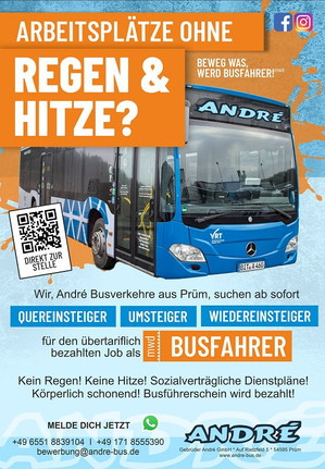 Dann bewerbt euch jetzt. Hier geht's zu den Stellen: www.andre-bus.de/jobs